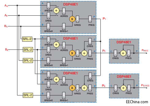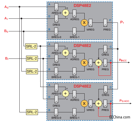 因此,利用内置加法器,您只需三个DSP48(一个用于计算P1,另外两个用来处理PI和PQ输出)就能实现复合乘法器。根据延迟需求以及其中表述的速度性能指令,需要增加一些逻辑以在不同数据路径间平衡延迟。为获取最大速度支持,必须对DSP48实行完全流水线化,从而让运算符整个延迟六个周期。随后在每个输入端增加一个两周延迟线,让实际数据路径和虚构数据路径保持一致。在每个输入位配备四个SRL2,并利用SRL压缩功能将四个SRL2打包到两个LUT中。通过在每个PI和PQ输出端添加累加器来最终完成复合MAC。此外,这个累加器会作用于较大的数据宽度,因此能更好地集成到DSP48 Slice中。图4显示7 系列和UltraScale器件相应的实现方案,从而再一次展示了W-mux集成的优势。PI和PQ DSP48E2 Slice在吸收累加器时可节省40%资源。值得一提的是,该方式还减少了延迟,对一些应用十分有益。