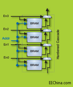该级联使建立需要多个BRAM的大型内存成为可能,同时占用空间极少,支持最高时钟速率以及最低功率消耗,而这些在7 系列器件上则无法实现。比如,在7 Se系列器件上,通过配置为16K×2位的八个BRAM(36K)实现存储16位数据的16K内存,以避免外部数据复用,而这样则需要增加逻辑资源和延迟,并会影响计时与布线拥塞。从动态功率角度来说,这种方法效率较低,因为在所有读取或写入操作中都要启 动这八个Block RAM。最佳解决方案包括使用2Kx16位配置,由于这样只需启动一个BRAM,因此消耗的动态功率只有上述方法的八分之一。级联功能连同动态功率门控功能正好可以在UltraScale器件上实现这种效果。