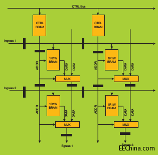 Block RAM级联的另一种直接应用与实现I/Q数据转换功能有关,通常与DFE系统的基带CPRI接口集成。图7展示了通常由一个NxM存储器阵列组成的高级交换架构。N入口流上的连续数据会根据其输出目的地写入到相应的Block RAM中并形成一行,且会从相应的Block RAM以一列的形式读取M出口流。因此,可以用BRAM级联有效实现每一列。