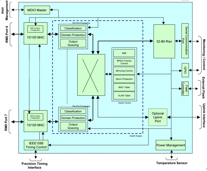 图3:符合IEEE 1588标准的MorethanIP公司八端口交换机架构框图