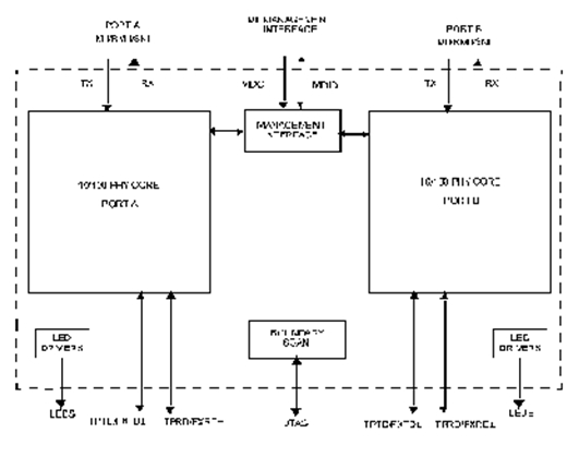 每个收发器都有两个完全独立的10/100Mbps端口供多端口应用使用,如图5所示。该收发器的端口切换还允许两个端口经配置提供完全集成的范围扩展、介质转换、基于硬件的快达ns级的故障切换(fail-over)以及端口监测功能。