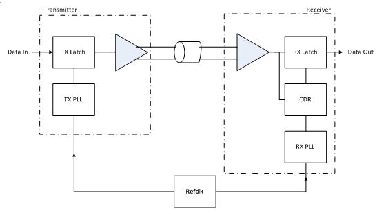 在公共时钟架构中(图1),单个Refclk源被分配到发送器和接收器。这种时钟方简单而普遍用于成本敏感的商业应用。支持扩频时钟(SSC)可最大限度地减小电磁干扰(EMI)敏感的应用中的电磁辐射。