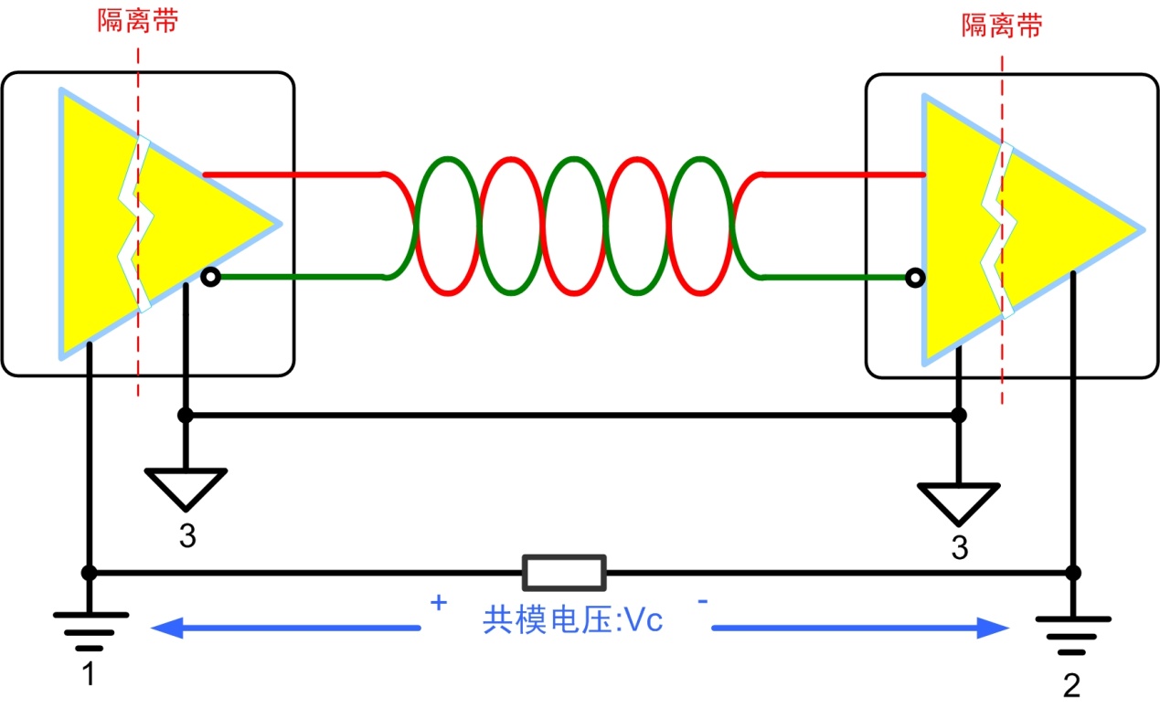 若直接将相距很远的通信节点分别连接至各自的本地大地,地电势差会以共模电压的形式叠加在总线发送器的输出端,叠加之后的信号可能远远超过接收器所能承受的共模输入电压范围,从而无法正常接收信号,严重还会损坏收发器。普通的CAN、RS-485收发器的共模输入范围较小,如SN65HVD251、SP3085两款收发器仅支持-7~+12V共模输入范围,大地流过各种大型设备注入的大电流,由此引起的地电势差可高达几伏、几十伏甚至上百伏,远远超出收发器所能承受的电压范围。