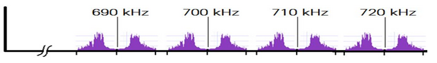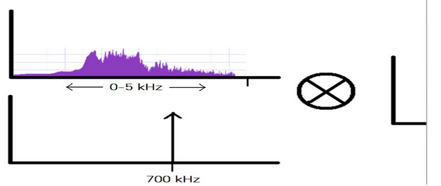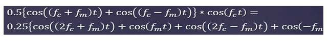我们的 AM 信号如果用公式来表达,涉及多个信号的乘法运算,这在时域或频域中是很难想像的,因为我们仅仅看到音频是什么样的。但是上述这种对应关系告诉我们:两个信号相乘可用两个信号相加来表示!现在,我们很容易在频域中绘制出经乘法运算得到的信号。