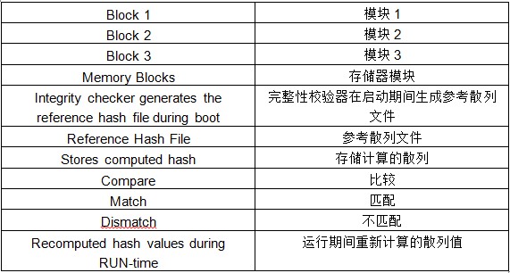 如果两个散列值不匹配,校验器则为中央单元报告安全入侵,此中央单元根据安全策略决定要采取的措施。如果此值匹配,完整性校验器启动并验证后续存储器模块的内容。继续这一过程,直到片上系统将运行。完整性校验器的扫描速率应当是可配置的,因此用户可以实现存储器模块验证速率和存储器带宽利用率之间的平衡。