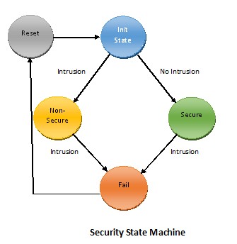 这个硬件模块可以被视作软件入侵、电压篡改等安全相关事件的片上系统中央报告单元。借助此安全相关的事件信息,安全漏洞响应单元可以确定片上系统的下一阶段。此单元的操作可以通过以下状态机的方式来进行最佳诠释(图4)。