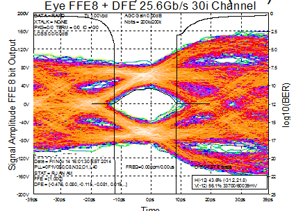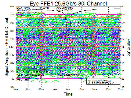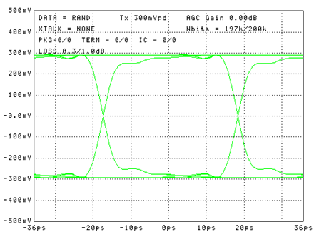 如图所示,在对应28Gbps的频点上,信号能量被衰减了30db,电压幅度只剩3%了;在对应56Gbps的频点上更惨,65db意味着信号电压摆幅剩下不到千分之一。在这种信道中,发送端一个完美漂亮的数据眼图: