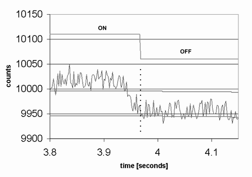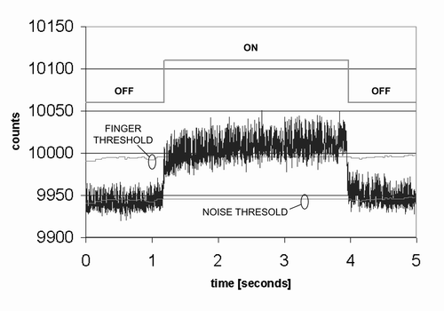 差分计数是通过主PC上一个终端仿真程序获得,然后借助电子制表软件绘制而成的。将手指在10mm厚的玻璃覆盖层上按压3秒。按键的开关状态会被叠加在原始计数上。按键在这两种状态之间快速转换,哪怕是由于通过厚玻璃进行检测而使原始计数信号中具有较大的噪声时也是如此。请注意手指和按键门限随着基线的漂移而进行周期性调整。当检测到手指的触压动作时,基线值将锁定,直到手指移开为止。