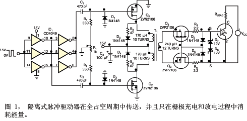 晶体管Q3和Q4分别为Q5的输入电容传输充、放电脉冲,然后关断,在Q5输入电容两端产生一个高阻抗,使Q5栅极电压不能发生变化,除了由于微小的泄漏