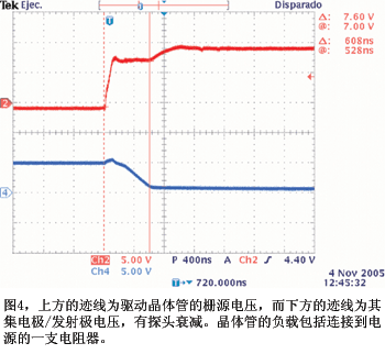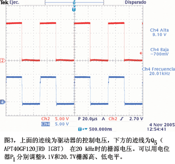 图2是与一只1欧元硬币和一支功率晶体管相比较的驱动器原型电路。晶体管是Advanced Power Technology的APT40GF120JRD,包括一个IGBT和一个FRED(快恢复外延二极管),它工作在最高1200V和60A,栅源电容为4 nF。晶体管采用JEDEC SOT-227封装,外形尺寸约为1.5英寸×1英寸 (38mm×25 mm)。图3和图4为图1电路在 20 kHz驱动IGBT Q5的实验波形。导通延迟大约为600 ns,0.33W功耗时的总耗电为22 mA。当驱动晶体管的栅源电容较低时,电路的导通延迟和功耗均会减小。
