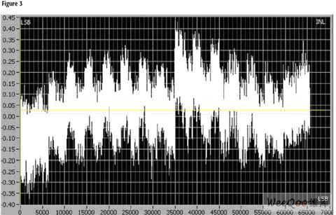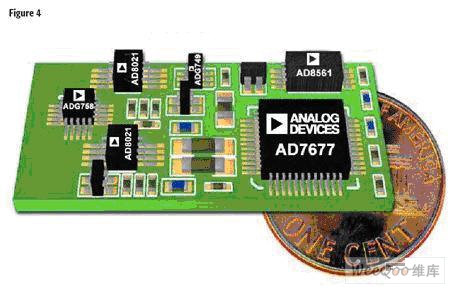 图3示出该电路设计的线性误差。在这种最高增益设置条件下达到如此低的线性误差(图中示出最大值为0.44 LSB,最小值为-0.37 LSB)并非易事。这相当于±0.9 ppm的典型误差。当增益为8时,输出噪声为85 μV rms。如果需要,可以利用软件平均进一步减少噪声。图4示出使用AD7677*估板构成的完整数据采集系统,印制电路板面积为15×30 mm。
