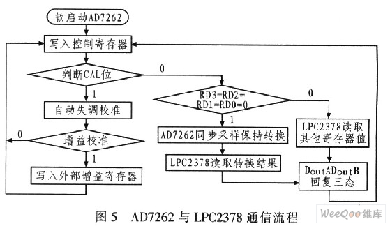 由于LPC2378和AD7262都兼容SPI接口,两者的编程只需按照时序图进行即可。此外LPC2378还有许多其他类型接口,所以便于实现网络化,详细流程参见图5。