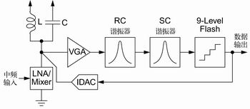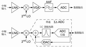 图1对将一个中频信号进行数字化的两种方法进行对比。第一种方法需要几种大功率的模块,即,可变增益放大器(VGA),抗混叠滤波器(AAF)和ADC,而第二种方法将此模块用一个带LC谐振电路的带通SD ADC所替代。借助时间连续环路滤波器,带通SD ADC对固有混叠进行保护,省去了AAF。由于ADC的输入噪声较低,且它的电流型输入能提供较强的信号,所以它的动态范围较宽,因此,也省去了VGA。通过将这两个高耗电模块纳入到ADC中,第二种简单的拓扑结构具有节电优势。
