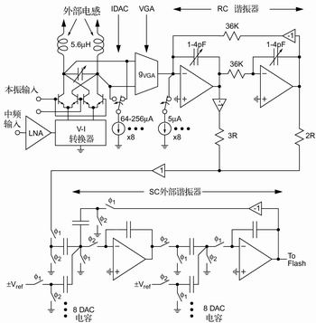 ADC的第二个谐振器也使用了一个LC谐振电路。图3中的VGA和有源RC谐振器消耗2mA的电流,并且不需外部元件就能满足第二级动态范围的要求。可编程电容阵列可以实现RC谐振器的调谐。