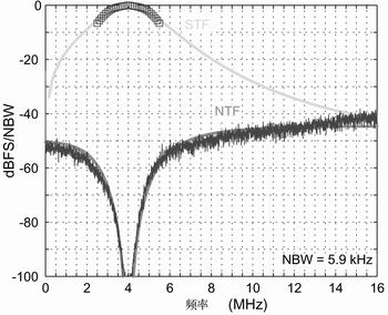 如图4所示,调制器的通带设计为fCLK/8,较好地协调了期望噪声密度和测量噪声密度。同时,图4描述了一个信号传递函数(STF)。所测量的STF很平坦,在大约500KHz的范围内,每100KHz下降0.1dB。