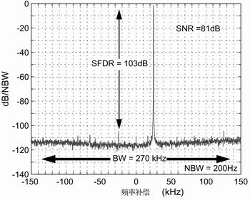 图5中过采样率OSR=48,时钟频率fCLK=26MHz时,输出频谱的信噪比(SNR)为81dB,非杂散的动态范围为103dB。图6表示fCLK=32MHz时,OSR=48的动态范围为90dB;OSR=960的动态范围为105dB。