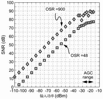 图6 fIF=273MHz,fLO=269MHz,fCLK=32MHz时SNR与输入功率的关系