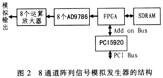 实际设计中需要模拟的是8路的阵列信号。根据设计需要,在本阵列信号模拟发生器电路中使用了8个工作在Modulator Slave模式下的AD9786, 同时使用1个Xilinx公司的Spartan IIE FPGA作 为主模式器件。在系统中,主机负责模拟并产生65 536点的周期通信基带信号数据。FPGA主要负责与PCI桥路PCI5920的接口通信以读取主机的命令和来自主机的通信基带信号数据,并将所读取的数据存储在模拟器上的大容量SDRAM中。当系统工作时,FPGA将SDRAM中存储的数据输入到 AD9786并提供1个MODCIJK时钟作为AD9786 的调制同步时钟,同时它还负责对AD9786的控制模式寄存器进行配置。AD9786工作在8x内插模式下,使用80MHz的DACCLK差分时钟,通过设置 MODADJ来改变调制相位,通过DATAADJ来改变数据锁定的时刻以保证多路输人数据之间的同步关系。8通道阵列信号模拟发生器结构框图如图2 所示。