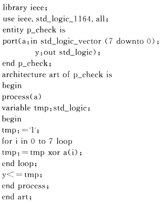 若采用传统的设计方案,首先需要画出8变量真值表,8变量真值表需要28行(即256行),这就非常麻烦,而逻辑函数的化简更是难上加难。如果借助 Max+PlusⅡ软件,使用VHDL语句,按照8位奇校验逻辑功能,用软件方法来实现硬件设计。8位奇校验电路的VHDL程序如下所示: