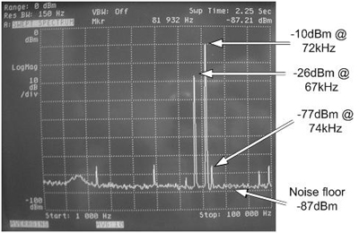 从图 5.13 – 5.14 中,我们可以看出,当分辨率带宽降低时,固有噪声则从 –87 dBm 增加到 –80 dBm。另一方面,当分辨率带宽发生改变时,频率处于 67 kHz 和 72 kHz 时的信号幅度并未发生改变。固有噪声之所以受分辨率带宽的影响,是因为其为热噪声,因此,带宽的提高也增加了热噪声总量。另外,由于信号波形为正弦波曲线,而且不管带宽如何变化,带通滤波器内部的振幅都会保持恒定,因此,频率处于 67 kHz 和 72 kHz 时的信号幅度并不会受分辨率带宽的影响。因为我们必须清楚在频谱密度计算中不应该包含离散信号,所以,有关噪声分析方面的特性应引起我们足够的重视。比如,当测量运算放大器的噪声频谱密度时,您会发现频率在 60 Hz(功率上升线)时出现的一个离散信号。因为这个 60 Hz 的信号并非频谱密度,而是一个离散信号,所以它并未包含在功率噪声频谱密度曲线中。