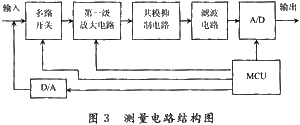 由前述检测原理归纳可得出为满足BIT的要求,主要有两种测试信号需要注入到模拟电路中。一种是直流电压信号,一种是阶跃信号。使用MCU控制一个附加的D/A输出所需的测试信号。电路结构图如图3所示。