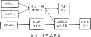 首先通过阶跃响应的建起时间是否超过采集器最大建起时间判断滤波电路是否故障。再判断采集器的增益、共模抑制比等参数是否满足要求。如果某个参数的相对误差超过阙值,则认定采集器故障。若共模抑制比小于采集器允许的最小共模抑制比,判断为共模抑制级故障,否则判断为放大电路故障。图4为诊断流程图。若判断出有功能模块出现故障,通过前述诊断原理将故障尽可能定位到元件。若未出现故障,可将计算出的采集器参数用于数据修正。