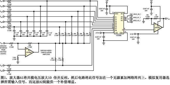 消除 CMV 误差有很多方法。包括一种在接地互连处使用大量铜箔的强力方案,用全差分仪表放大器信号调整器,以及使用电流隔离器。根据不同因素在CMV问题中所占比重,以及需要CMV矫正的信号通道数量,每种方法都能找到自己的位置。最常用和最有效的一种CMV矫正方式是差分放大,即采用模拟量减法,从信号中去除CMV分量。这种方法的缺点是每个信号通道上都需要一只专门的放大器。图1中的电路是差分放大器思路的一种变型,它将两个共享的CMV放大器与八个复用通道中的简单无源电阻对组合起来,以最少的元件数量为大量模拟通道实现CMV消除。