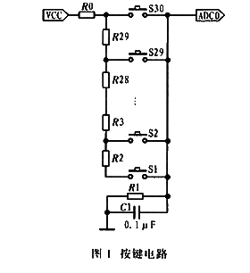 在单片机应用领域中,人机交互的途径和方式灵活多样,但键盘输人仍然是最常见、最重要的方法。通常实现键盘接口的方式有:直接输入、矩阵结构、A/D方式、键盘和显示复用、并行扩展、串口扩充以及用键盘和显示专用控制器件。本设计使用A/D转换的方法,其硬件电路简单,按键电路与MCU的连线少,易修改,而且可以节省MCU有限的I/0资源。但在处理按键数目较多的情况时,往往会出现按键不可靠的问题,如按键没有任何反映,按键功能交叉。本文除了给出A/D按键的硬件电路外.着重介绍利用软件技巧来实现可靠的键盘接口。