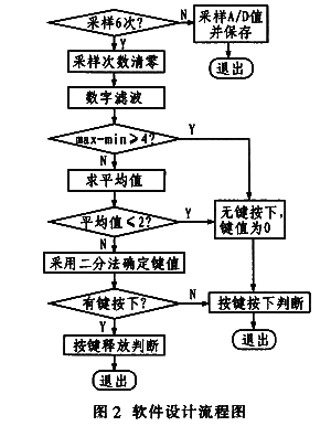 软件设计是加转换按键处理的核心,一旦检测的A/D值不准,按键操作就会产生误动作和不动作,按键数目达到二三十个时,这种现象会经常出现,针对此种情况,本文在软件设计中做相应的技巧处理,按键处理程序的软件设计流程如图2所示。