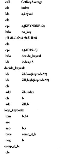 首先,电阻阻值的选择决定了按键的数目,考虑到电压误差、电阻精度等因素,R0的阻值不能太小。由实验得知,R0的阻值为20 kΩ~100 kΩ比较合适。ATmega168的A/D转换精度为10位,为提高按键分辨率,并保证按键的准确性,本设计只用高8位,而且设定相邻按键键值的差值一致,也就是将256等区间划分,这样可以实现较多的按键。然后根据定义好的键值用电阻箱确定相应阻值。该程序每隔2 ms处理一次,每次采样一次,共采样6次,所以确定一次平均键值需要12 ms。延时去抖是通过再次求平均键值完成,故确定按键是按下还是释放需要24 ms,这样不仅可以保证按键可靠,而且无需再加延时去抖过程。当采样6次后进行数字滤波,舍去其中的最大值和最小值,并且判断最大值与最小值之差是否超过2,是则认为无键按下,否则就将其余的4个采样值求平均值。当按键数目较多时,为提高按键处理程序的速度,在键值确定和按键识别程序中采用二分法,即先与中间键键值比较,如果所得键值比其A/D值小则与前面按键的键值比较,否则与后面按键比较。考虑到电压波动、电阻精度以及人为操作等各方面因素的影响,对凡是符合每个键值±l区间的平均值都认为是正确的按键识别,否则为无键按下。