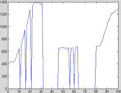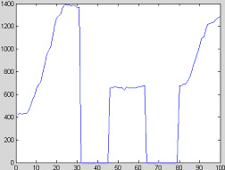 在进行数据采集时会在连续的数据中出现零值点,出现零值点有两种可能:一种是正常书写时笔划的改变造成的,另一种就是由于触摸屏不够平整或是书写时的抖动造成笔迹的间断而造成的,区别的方法主要是看间断时间也就是零值连续出现的个数,一般抖动造成的间断时间小于设定的采样时间10ms,所以,抖动产生的零值在两个有效数据中间只能出现一个,可以认为是无效零值,而出现两个以上的连续零值便可以认为是笔划的改变而生成的有效零值而不作处理,当判断出某个零值为无效零值后,对其进行线性内插来弥补数据的丢失,即