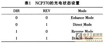 将NCP370的DIR端强制拉低,并将DEV端拉高,NCP370即可进入正向充电状态。而将DIR端置高时,OUT端会与IN端断开,具体的充电状态设置如表1所列。另外,DIR也会受到OVLO或U-VLO故障的影响(FLAG有效)。