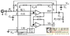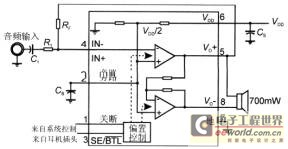 (1)在便携式音频设备中,电路供电电压为3.3V。在8Ω负载单端输出62.5mW的情况下,桥式可输出4×62.5=250mW。即有6dB的功增加。在增加功率输出的同时,对频率响应也应加以注意。