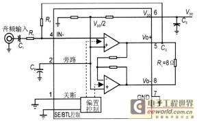 例如,在8Ω负载,输出耦合电容为68μF时,将对293Hz以下的频率加以衰减。而在BTL模式下,抵消了直流失调电压,省掉了输出输出耦合电容,低频特性只取决于输出回路和扬声器特性。同时电路体积和造价也相应降低。