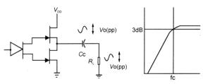 在图6 所示的SE(单端)输出情况下,接至负载的隔直耦合电容Cc是必不可少的,该电容器的容量比较大(3.3μF~1000μF),重量也较大,占印刷电路板的面积大,价格较贵。这个电容对系统的低频响应影响很大。这是由于这个电容和负载间形成的高通滤波而造成的。角频率可由下式计算: