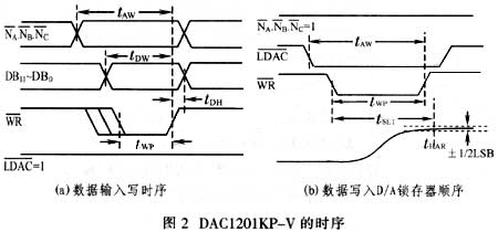 由时序可见,DAC1201KP-V的双缓冲方式决定了其与微处理器的时序操作非常灵活。