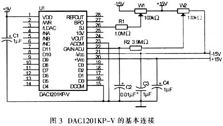 退耦处理:为了得到最佳的性能和噪声抑制,可按图3所示增加电源退耦电容器(1μf-10μF钽电容器),应紧靠DAC1201KP-V。