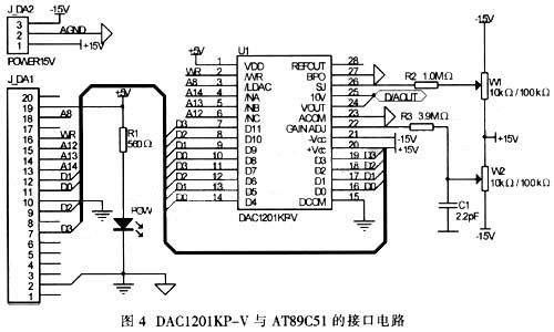 DAC1201KP-V的分辨率高、转换速度快、接口方便、电路简单、应用灵活,因而具有广泛的应用前景,笔者在指导2005年全国大学生电子设计竞赛的F题"数控直流电流源设计"中利用该电路按图4所示的接线方式取得了很好的控制效果,满足了设计指标的要求。