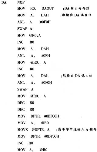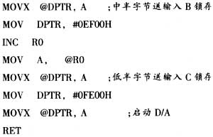 下面根据图4所示的硬件结构介绍DAC1201KP-V转换软件的实现方法,单片机晶体振荡器的 频率为6.000MHz,入口条件是待转换的数据高8位存于DAH中,低4位在DAL中的高4位,NA地址是BF00H,NB地址是DF00H,NC地址是FF00H,LDAC地址是FE00H。占用资源是A、R0、DAH和DAL、DAOUT连续的3个单元。