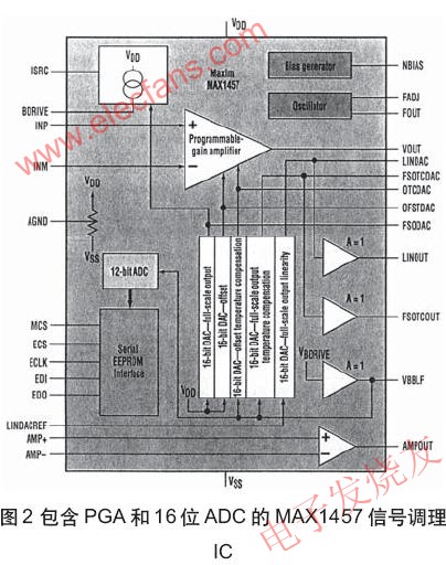 带线化前端的Maxim公司的MAX1457(图2)传统器线性化IC就是其中一种,它包含12位ADC。ADI公司的ADC7707高精度信号调理16位S-D ADC包含多路转换器、缓冲器、PGA、电荷平衡电路、串行接口和时钟产生器。ADI公司的ADC7708/18S-D6位/24位ADC具有与AD7707相同的电路,但它们的目标是低电压和低功率应用。