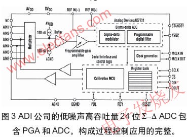 一个感兴趣的高集成度ADC是ADC7731 24位S-D器件。它具有ADC77017的所有电路。另外,还加上定标微控制器(图3)。此IC的目标是低噪声高吞吐量应用。Maxim公司也有带集成PGA的双6位ADC,它具有90Sample/s吞吐率、功耗仅550mW。