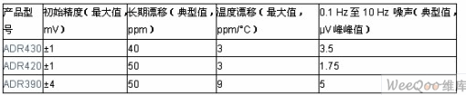 针对高精度应用选择基准电压源时,需要考虑四种可能的误差源:初始精度、输出电压的温度系数、长期漂移和输出电压噪声。表1列出了ADI公司的其它2.048 V精密基准电压源候选产品及其特性。
