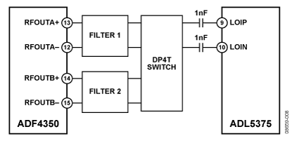 常见变化当单个滤波器无法完成所需的宽带操作时,可以使用ADF4350的辅助输出,在两种类型的滤波器之间切换。图8显示了这种情况:使用一个RF双刀四掷开关(DP4T)选择滤波器1或滤波器2的差分输出。