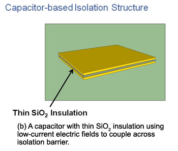 图1. (a) 带厚聚酰亚胺绝缘层的变压器,电流脉冲产生磁场,在另一个线圈中感生电流;(b) 带薄SiO2绝缘层的电容,利用低电流电场将数据耦合到隔离栅的另一端。