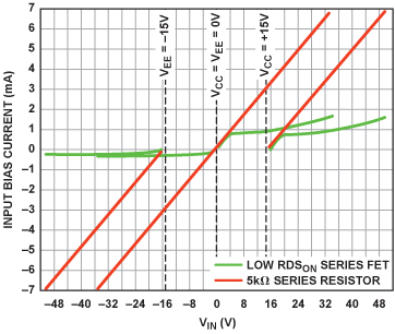图13. 有电源和无电源两种情况下ADA4096-2输入过压保护的限流