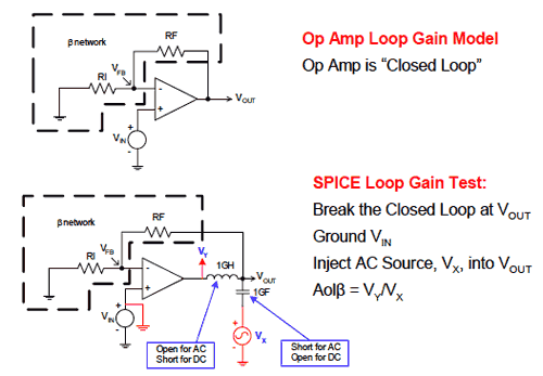 环路增益测试:在VOUT、地与VIN之间将环路打破,并插入一个交流源Vx,Aolβ=Vr / Vx在分析用SPICE 仿真构建的电路时,传统环路增益法利用一个电感及电容将闭环运放电路打破。很大的电感值可确保环路在直流上闭合(要求SPICE 仿真能在进行交流分析以前先计算出直流工作点),但在感兴趣的交流频率上打开。很大的电容值可确保交流小信号源与直流隔开,但可直接与感兴趣的频率相连。图1.17 显示用于传统环路增益测试的SPICE 设置示意图。