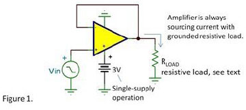 在这种规格状态下,在输出靠近接地时,放大器必须通过负载电阻器吸取电流。它反映了放大器测试的方法,其确保它能够正确地输出和吸取电流。这是测试和规定放大器的一种明智、保守的方法,但它却不是连接你的负载的方法。假设你的负载如图1所示连接接地。负载电阻器实际帮助下拉输出至接地,而吸取电流也无需放大器。