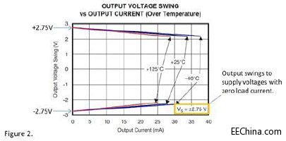 在这种状态下,大多数CMOS运算放大器的摆动均可非常接近接地—小于1到2毫伏。规格可能并没有重点说明这种能力,但其已显示在图中。图2表明,输出电压摆动与输出电流相关。该图可能受益于高精度,但你会看到在进行这种测试时输出电压与具体的电压轨相交,即±2.75V。单电源工作时,V-电源等于0V。