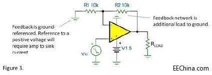 现在,我需要增加一些附加条件。注意,在图3中,反馈网络参考接地。你需要考虑放大器负载的所有源,不仅仅只是RL。在这种情况下,R1 + R2为同RL并联的有效附加接地参考负载。但是,如果R1参考正电压,则输出接近0V时需要放大器来吸取来自反馈网络的电流,并且输出摆动无法非常接近接地。