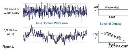 运算放大器的1/f (one-over-f)低频区域噪声好像有一些神秘。1/f噪声也被称作闪烁噪声, 像一道闪烁的烛光。在示波器上使用慢扫描来观察1/f 噪声可以看到一条漂移的基线(如图1所示),因为高频噪声叠加在较大的低频成分上。1/ f噪声通常被比喻为粉红噪声,同样揭示出较大的低频噪声成分。闪烁噪声经常在物理系统和生命科学中出现。1/f 噪声和天气一样, 是一个缓慢变化的过程, 你可能需要很长的时间才能观测到。我并不打算解释为什么1/f噪声会在半导体中存在------这是一个很深的主题!